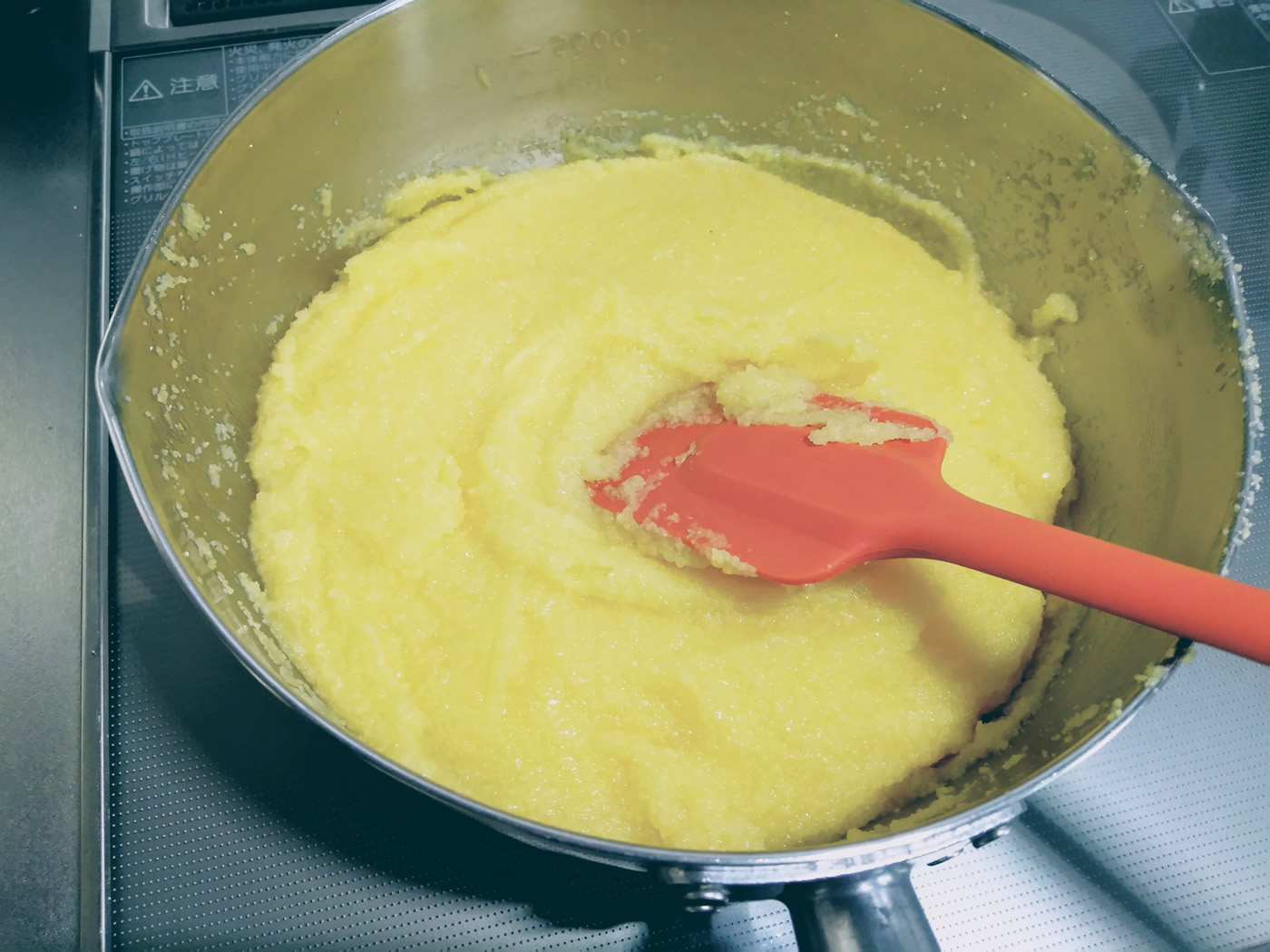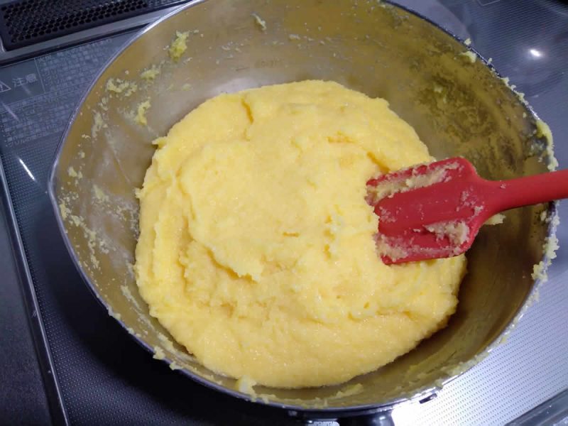 ゴムヘラでかき混ぜながら、20分ほど弱火で煮詰めます。このとき、火が強いと気泡が弾けたときにコーングリッツが飛び散るので注意。