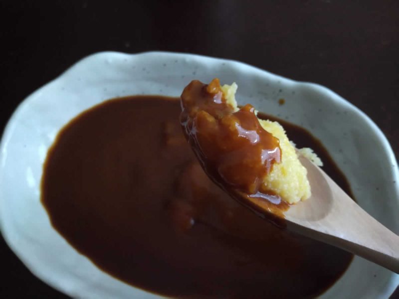 皿にポレンタを入れ、別皿のカレールー(インスタント)を用意。カレーを付けながら食べることで、自分で味の調節ができるようにしてみました。