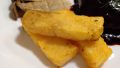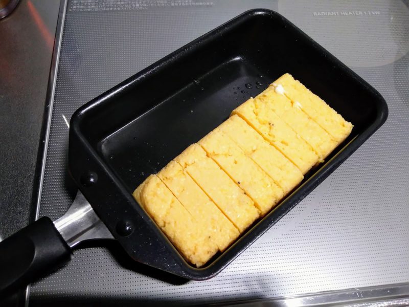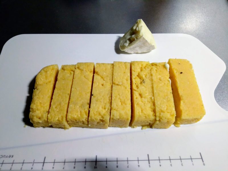 この分量で作っておいたポレンタを冷蔵庫で保管しておいたものをとりだし、スティック状にカット。