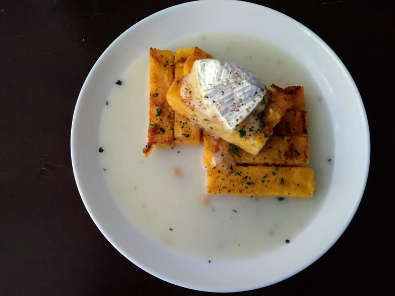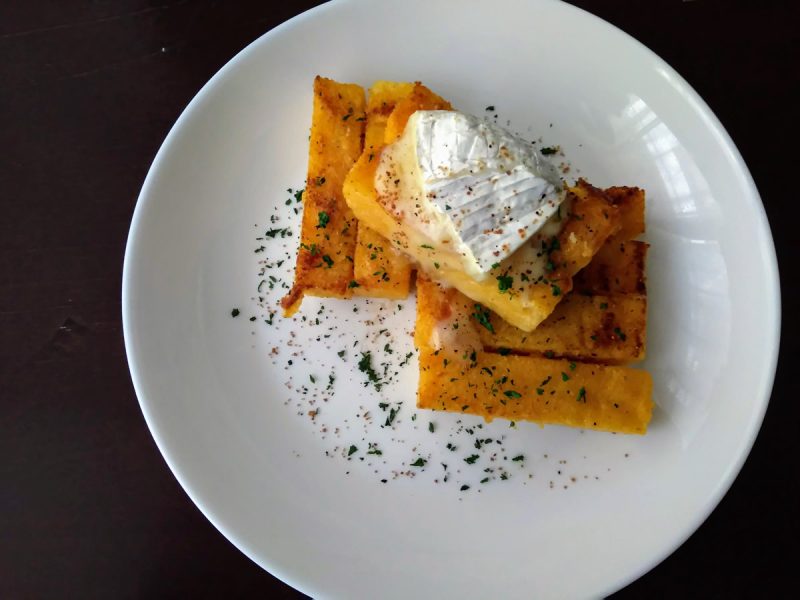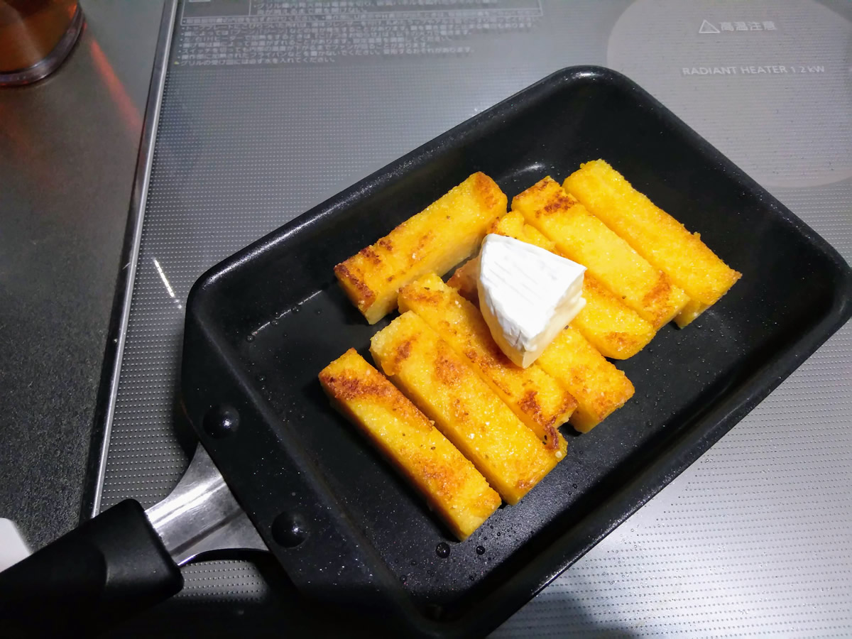 カマンベールチーズはそのままでもおいしいですが、ポレンタにオン!