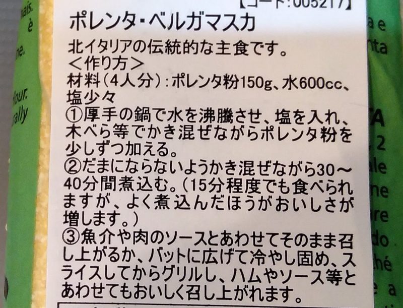ディヴェッラのインスタントポレンタを使い切り、さっそく新しいポレンタ粉を入手。グリーンのストライプが楽し気なポレンタ・ベルガマスカでポレンタしてみました。