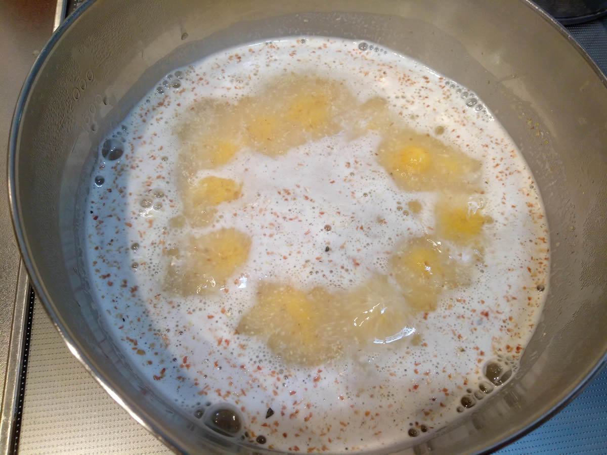 鍋にお湯を沸かし、ポレンタを入れたらよくかき混ぜます。焦げ付かないようにかき混ぜながら加熱し、水分が少なくなりすぎたら継ぎ足して、40分間火を通します。 お粥を炊いたときのようなほっこりとしたほのかに甘い香りが漂ってきたら完成です。 時間をかけて調理することで、乾燥したトウモロコシが十分に水分を吸収し、ゆっくりと加熱されることでデンプンのもったりとした粘りとほのかな甘みが生まれます。