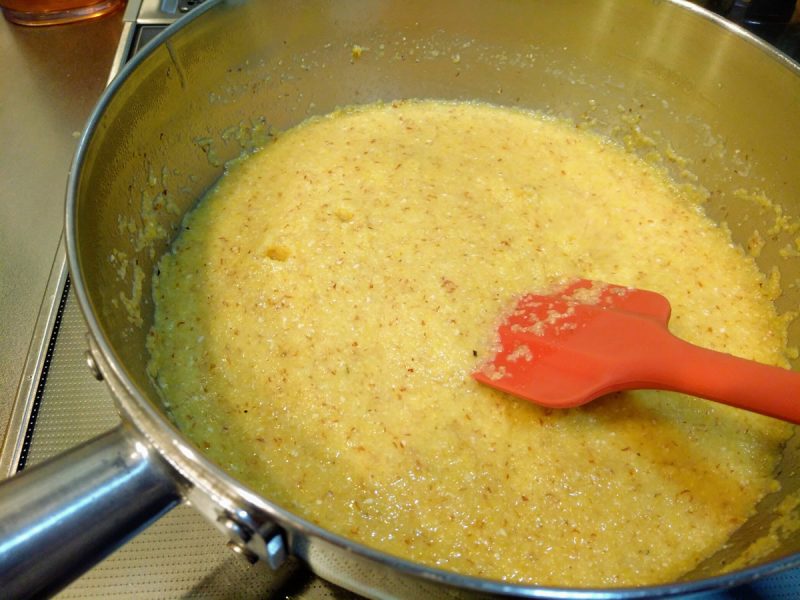 これまでのポレンタにも入っていましたが、濃い茶色の粒々が含まれている量もかなり多めです。とうもろこしの挽きかたもかなり粗めと言っていいでしょう。