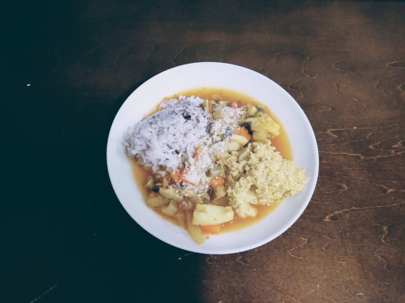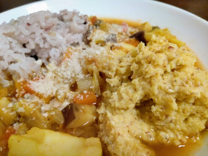 今回は、ご飯とポレンタを主食にして、野菜とイカを煮たカレー風味スープに浸しながらいただきました。
