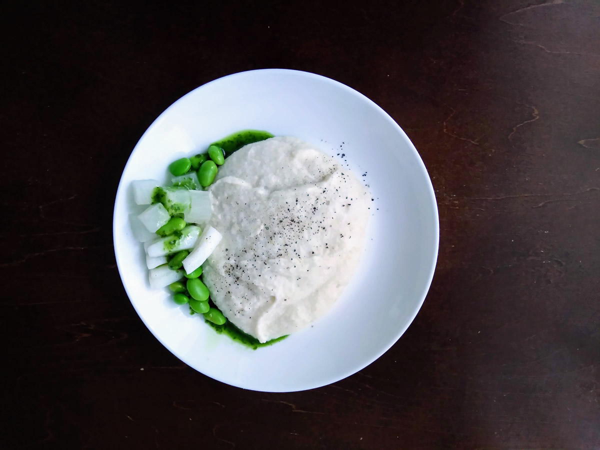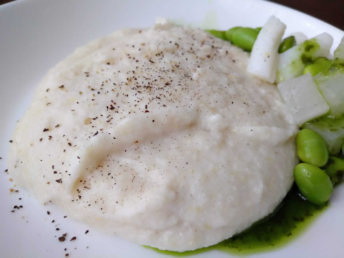 付け合せには、冷凍のイカ、大根、枝豆を軽い塩味で温めたものに、バジルソースをかけて。白ポレンタにかけてあるのは、黒コショウです。